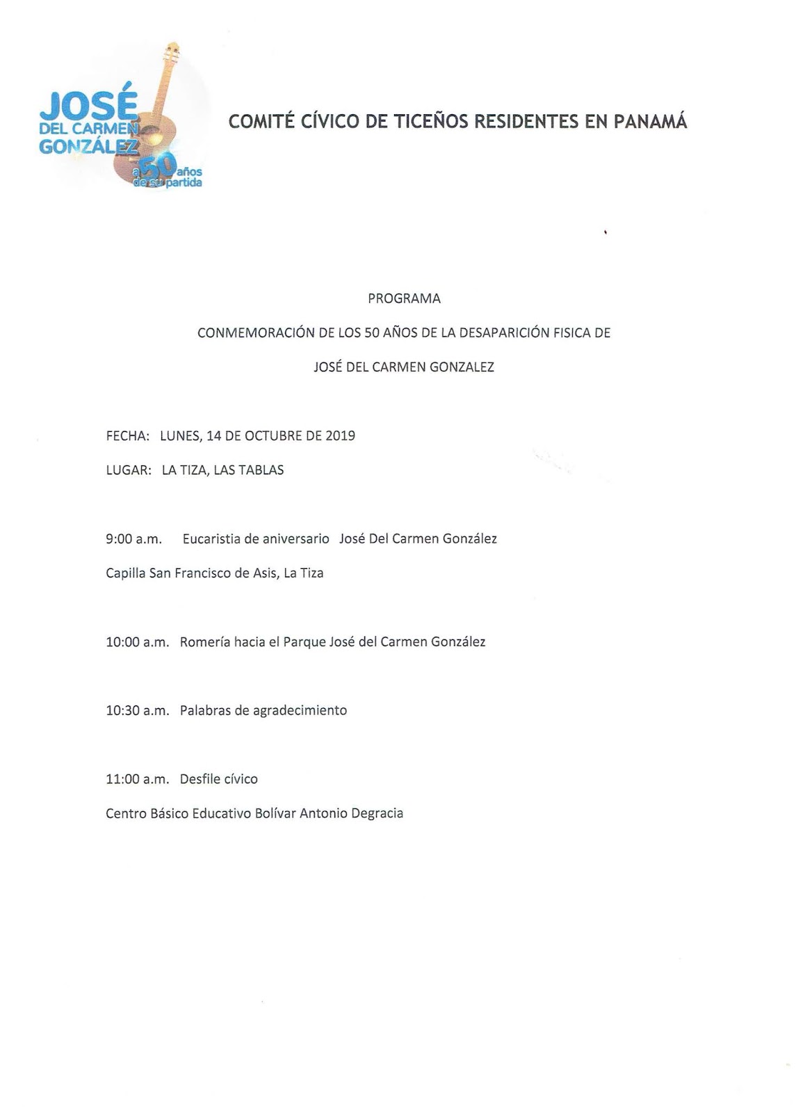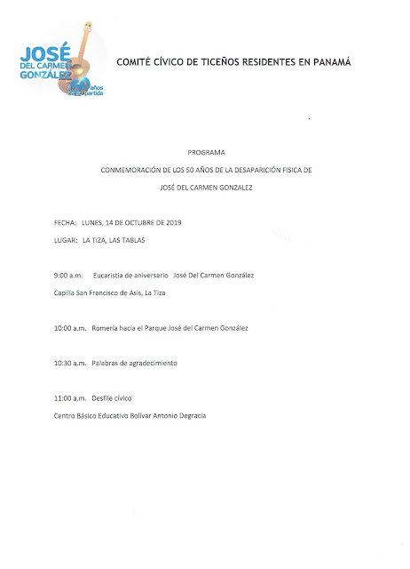 Con ocasión de esta importante fecha para el folclor panameño el Comité Cívico de Ticeños residentes en Panamá el lunes 14 de octubre en el pueblo de La Tiza de Las Tablas realizará una serie de actividades destinadas a rendir homenaje a este gran artista que incluyen misa en la Iglesia San Francisco de Asís y desfile cívico con la participación de los estudiantes, maestros y autoridades del Centro Educativo Básico General Bolívar Antonio De Gracia González hacia el “Parque José Del Carmen González”, restaurado recientemente con el apoyo del Centro Cultural de Las Tablas.